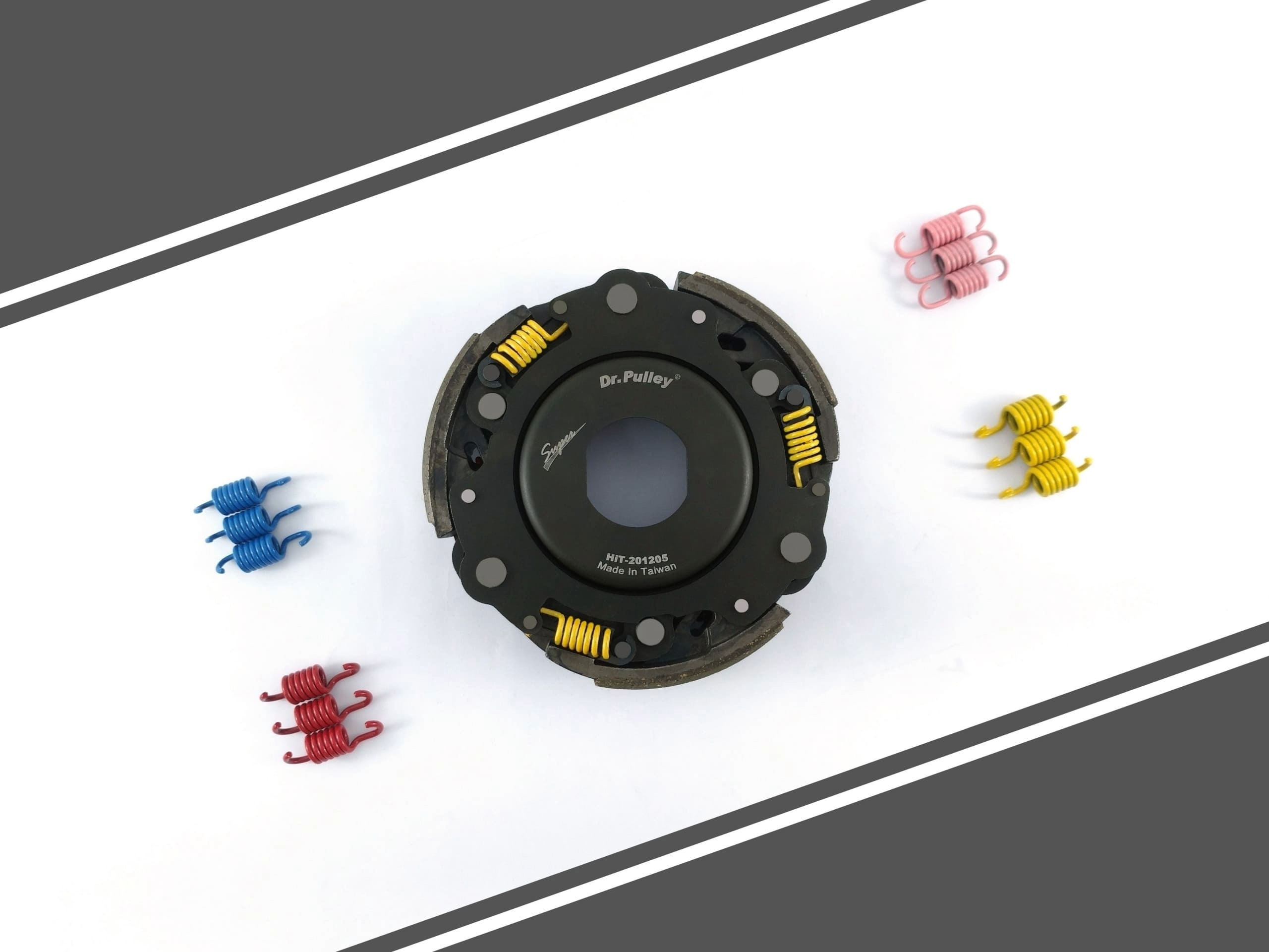 Dr. Pulley HiT High Thrust Clutch 201205 with 55 degree pillow springs for Linhai 260/300cc engines, Aprilia Leonardo 300, Eton Vector 250, SYM RV250, Yamaha Majesty 250, Yamaha Versity 300, Yamaha XCity 250, Yamaha XMax 250 and many more. The Dr. Pulley HiT Clutch has 2 sets of springs at work: the clutch spring inside controls the movement of the clutch pads towards the clutch bell through centrifugal power. The second set of torque springs (pillow springs), externally mounted, controls the pressure by using a push pin on the clutch linings against the clutch bell. This prevents most of the slipping phase of the clutch, thus creating less friction and allowing less heat to be created. Heat is lost power! Thus your scooter will accelerate much faster due to the power transfer occurring at a lower RPM. The clutch can be customized to all personal needs. For example, if you want to get more power at start, choose a stronger clutch spring to increase the starting RPM. If you want to shorten the slipping phase of the clutch, you should use a weaker torque (pillow) spring. For an extreme start, choose a strong clutch spring and a very weak (or no) pillow spring. Click Here to view the full Dr. Pulley HiT Clutch PDF. Overall Outer Diameter: 142mm Center Opening: 33mm (width), 36mm (height) 55 Degree Pillow Springs Includes Several Sets of Pillow Springs and Clutch Springs for Fine Tuning Reduces Clutch Slippage Improved Clutch Efficiency